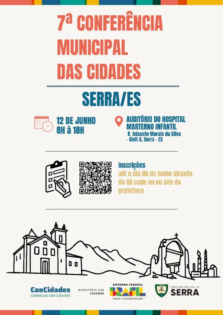 A Prefeitura da Serra, em parceria com a Secretaria de Desenvolvimento Urbano (SEDUR) e a Secretaria Municipal de Meio Ambiente (SEMMA), promove no dia 12 de junho de 2025 a 7ª Conferência da Cidade da Serra. O evento será realizado no Auditório do Hospital Materno Infantil, em Colina de Laranjeiras, das 8h às 18h, e busca reunir moradores, especialistas e lideranças locais para debater o futuro do município. A conferência é uma oportunidade para que a população contribua ativamente com ideias e propostas que moldarão o desenvolvimento urbano e ambiental da cidade.