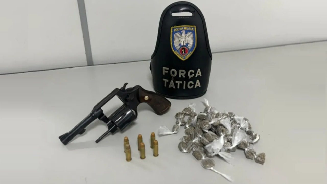 Enquanto a abordagem era realizada, uma adolescente, ao perceber a presença policial, surgiu na sacada do último andar das quitinetes e arremessou uma sacola. Dentro dela, os militares encontraram 80 buchas de maconha. Diante da situação, a equipe se dirigiu ao apartamento. Ao ser chamada, a suspeita afirmou que abriria a porta, mas antes arremessou uma arma de fogo pela janela, ação presenciada por parte da equipe da PM. Nesse momento, os militares forçaram a entrada no imóvel.