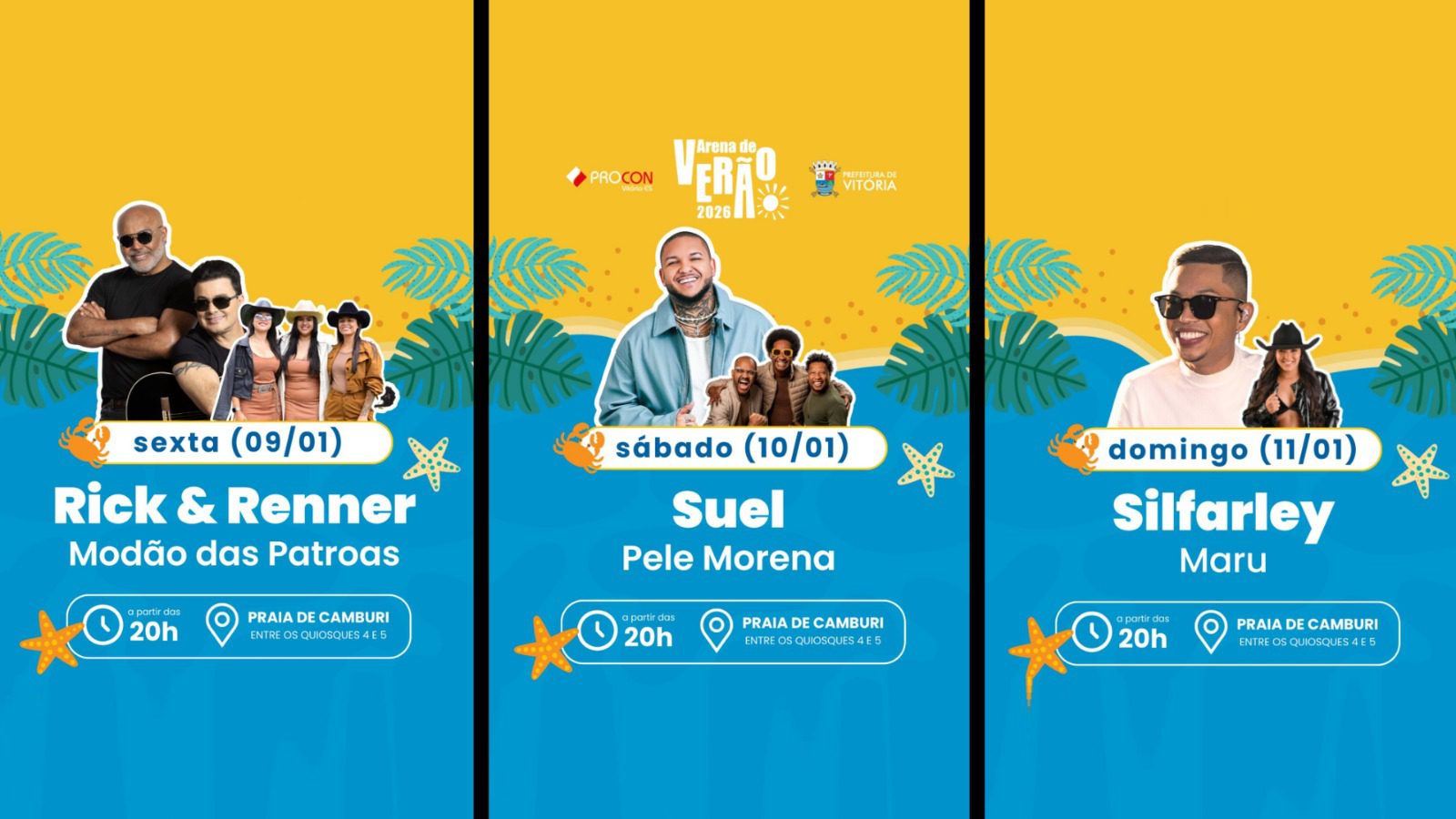 A Arena de Verão 2026 funciona diariamente das 7h às 22h30 e permanece aberta até o dia 25 de janeiro. Além dos shows, o espaço conta com ações e atividades promovidas por diversas secretarias municipais, incluindo Cultura, Esportes, Meio Ambiente, Segurança Urbana, CDTIV e Central de Serviços.
