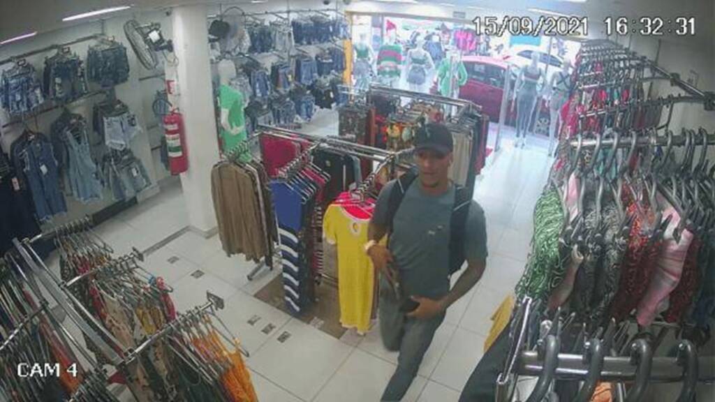 Ontem (15), o criminoso também assaltou uma loja de roupas, conforme aparece nas imagens abaixo.