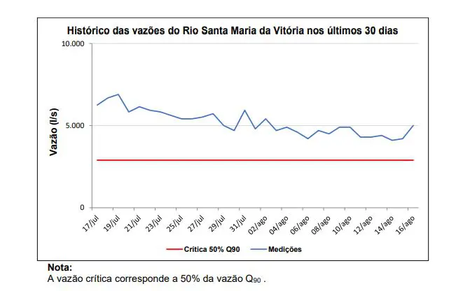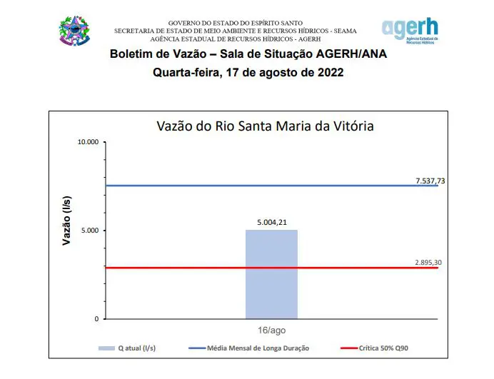 No entanto, de acordo com relatórios oficiais da Agência Estadual de Recursos Hídricos (AGERH), o nível de vazão de água do rio Santa Maria da Vitória atualmente está em torno de 5 litros por segundo, quase o dobro no nível considerado crítico, que é de 2,89l/s.