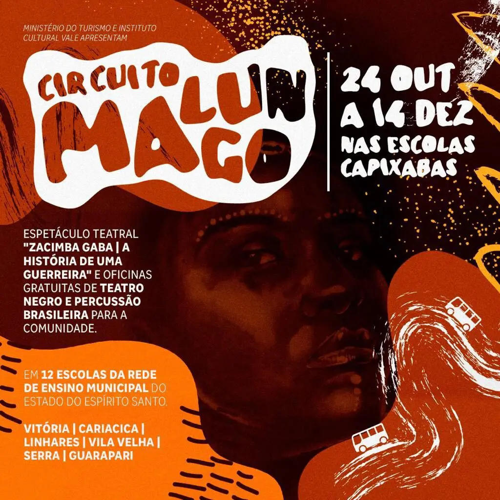 Doze escolas da rede municipal do Espírito Santo recebem até o dia 14 de dezembro, o Circuito Malungo. Alunos e comunidade de Vitória, Cariacica, Linhares, Vila Velha, Serra e Guarapari vão mergulhar na cultura afro-brasileira, com o espetáculo teatral “Zacimba Gaba – A história de uma guerreira”.