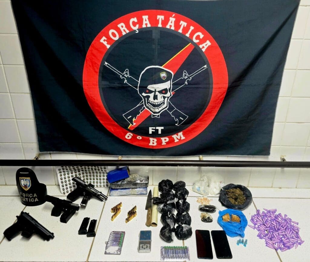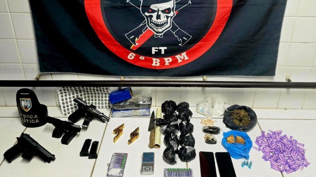 Entre os materiais apreendidos estavam 16 pedras de crack, 280 buchas de maconha, 119 pinos de cocaína, uma porção de cocaína, porções de “pack”, dois tabletes e meio de maconha, uma porção de crack e uma porção de maconha, além de uma balança de precisão e dois celulares. Também foram apreendidas três armas e munições que estavam com os suspeitos: uma pistola calibre 9 mm com 25 munições, uma arma falsa (simulacro) e uma pistola calibre .40 com 11 munições. A última chamou a atenção dos militares, pois possuía um brasão da Polícia Militar do Espírito Santo.