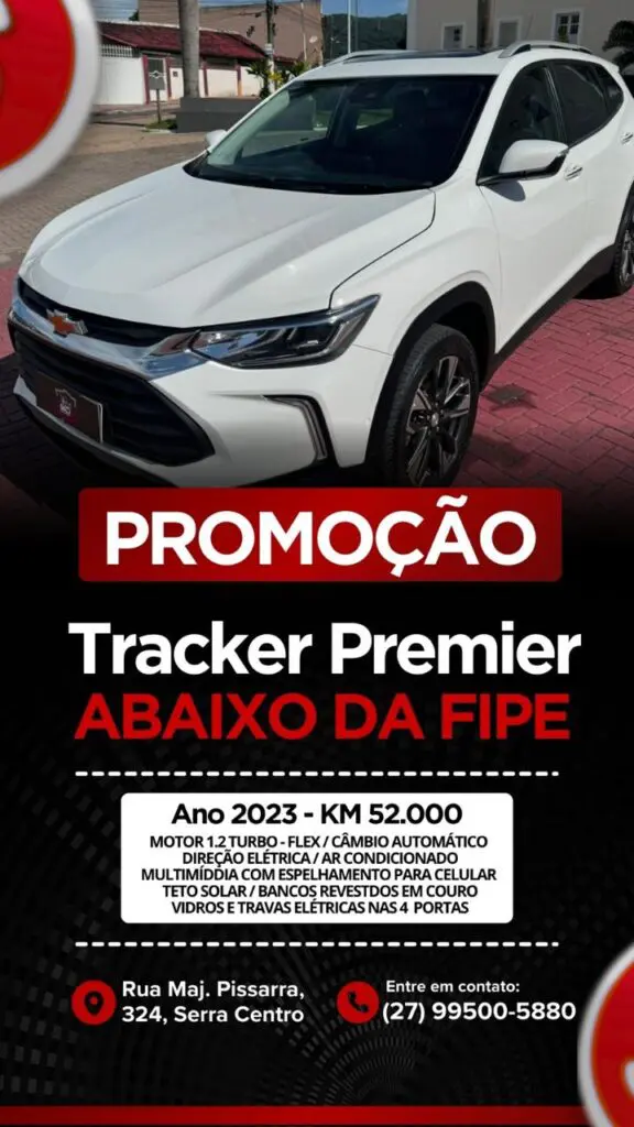- Tracker Premier – Compacto, moderno e tecnológico, o Tracker Premier combina conforto, conectividade e segurança em um SUV urbano pronto para qualquer trajeto.