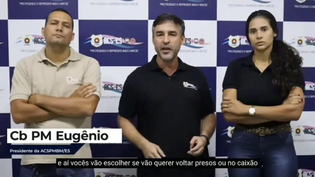 O presidente Cabo Eugenio mandou a letra, “Nós vamos buscar vocês onde quer que estejam, vocês (bandidos) vão aprender que aqui no estado do ES, não se toca um Policial Militar, são 10 mil reais de recompensa para quem trouxer informações para que nós possamos prender esses vagabundos que mataram o nosso Policial Militar, e aí vocês (bandido) vão escolher se vão querer voltar presos ou no caixão.”