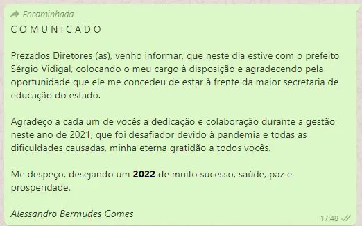 “Na tarde desta quinta-feira (30) Alessandro Bermudes colocou o cargo de secretário de Educação à disposição. A Prefeitura da Serra reconhece o desempenho e agradece o trabalho realizado na Secretaria ao longo de 2021.”