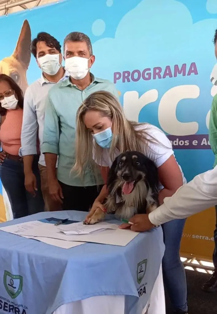 Durante assinatura do programa, o cão Maguila deixou sua assinatura no documento, o cachorro foi resgatado pela vereadora Raphaela Moraes, a parlamentar tem como bandeira na Câmara da Serra a causa dos animais.