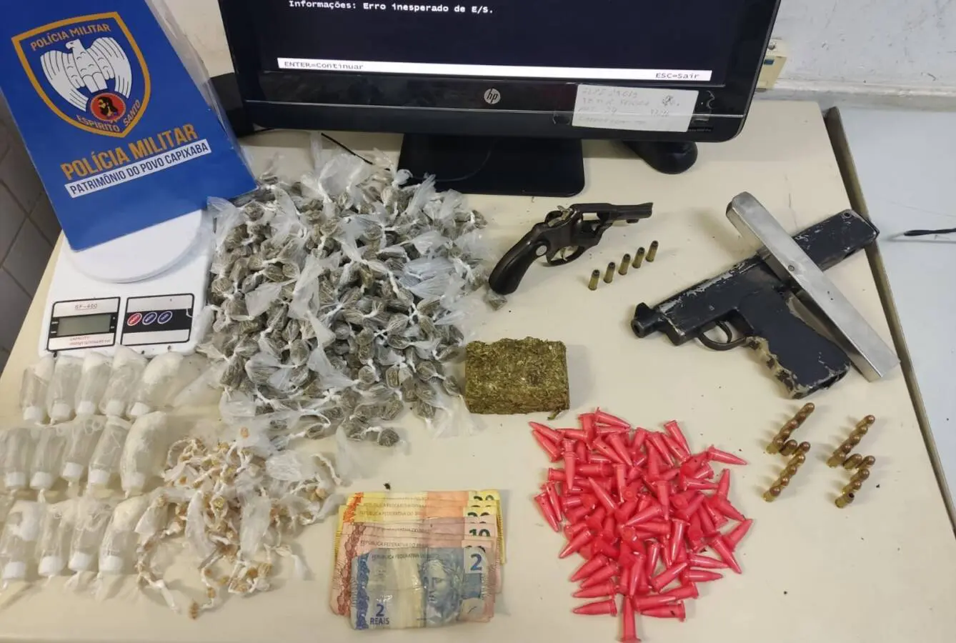 Os detidos foram, J.B.P de 21 anos e D.S.S de apenas 17 anos, com eles foram encontrados 90 pinos de cocaína, 15 frascos de loló, 21 munições. 380, 410 buchas de maconha, 1 pedaço de maconha 140g, 05 munições .32, R$ 232,00 em espécie, revólver cal. 32, submetralhadora cal.380 de fabricação caseira e balança de precisão.