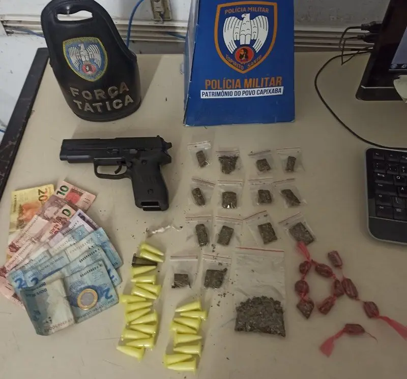 Na sexta-feira (21), uma equipe da Força Tática ao verificarem denúncia de tráfico de entorpecentes em determinada rua do bairro Nova Carapina II, viram que um rapaz, ao ver a viatura, correu e dispensou uma sacola. Ele foi detido e com a ajuda da equipe do K9, que trabalha com o apoio do cão farejador outros materiais foram localizados, sendo 122 pedras de crack, 72 pinos de cocaína, 63 pinos de haxixe e 40 buchas de maconha.
