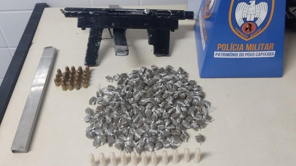 Na noite da última sexta-feira (13), por volta das 23 horas, policiais militares apreenderam um homem armado com submetralhadora de fabricação caseira, munição e drogas, na Avenida Santa Catarina, no bairro Central Carapina, na cidade de Serra.