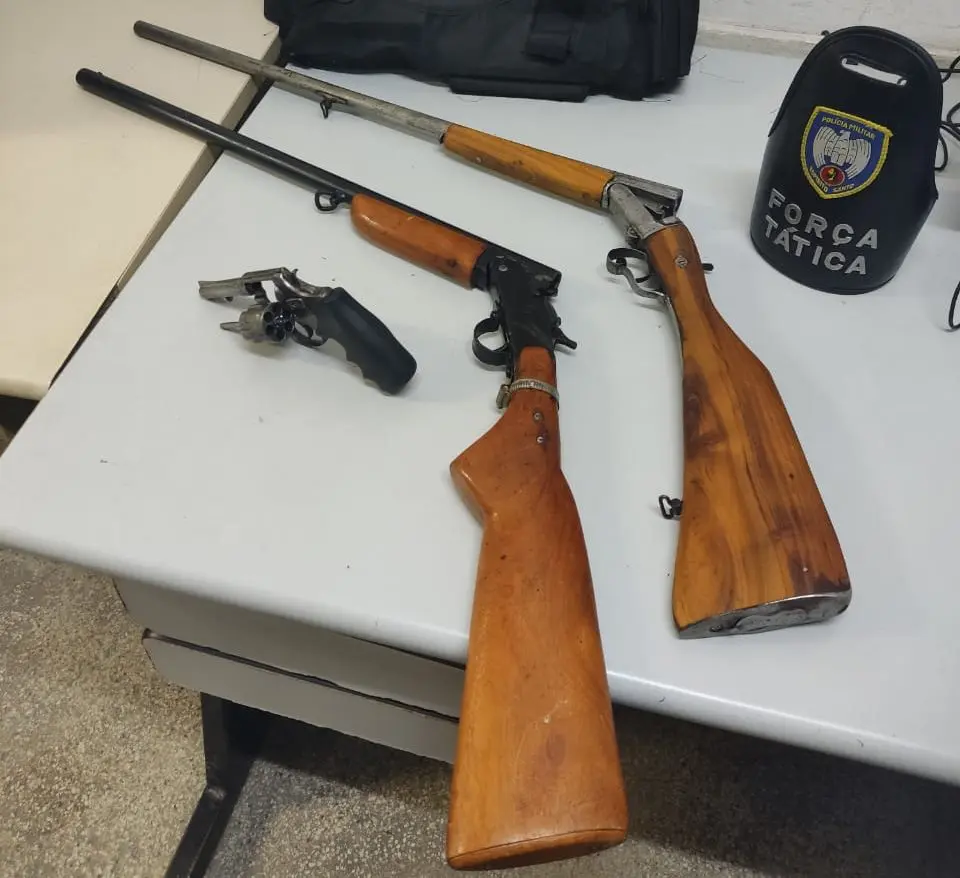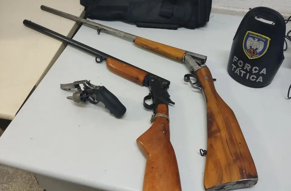 No local foi visualizado um indivíduo fugindo ao notar a presença policial. Na fuga o suspeito abandonou uma mochila contendo 02 espingardas cal. 28 e 01 revólver cal.32.
