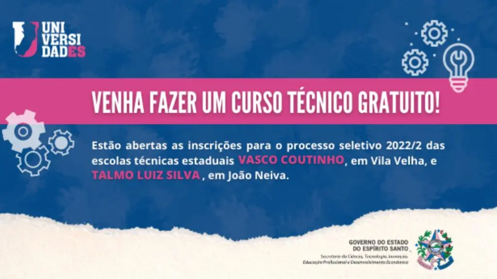 O Governo do Estado do Espírito Santo abriu, nesta segunda-feira (20), as inscrições para a admissão de alunos nas escolas técnicas estaduais Vasco Coutinho, em Vila Velha, e Talmo Luiz Silva, em João Neiva. A seleção é regida pelo Edital Sectides Nº 013/2022 e as vagas são para ingresso no segundo semestre de 2022.