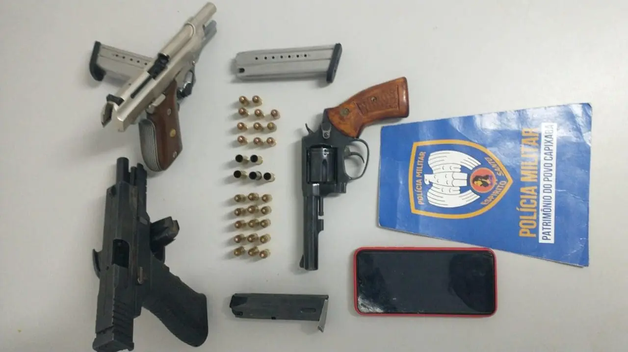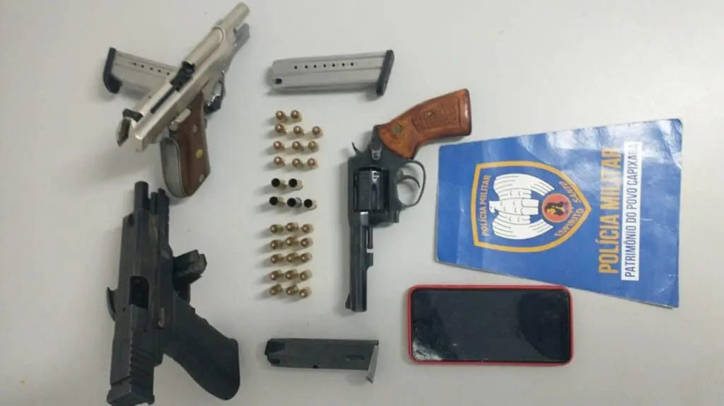 Reforço foi acionado ao local, e buscas foram realizadas na região, encontraram uma casa abandonada, onde foram encontradas três armas de fogo, um revólver calibre .38, e duas pistolas, uma de calibre .380 e outra cal. 9mm.