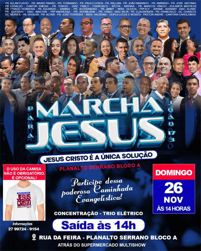 Neste domingo (26) as ruas de Planalto Serrano, Bloco A, serão o palco de um evento de grande significado para a comunidade, a grande Marcha para Jesus. Com início às 14 horas na área da feira, atrás do Multishow Supermercado, este evento não é apenas uma celebração religiosa, mas um símbolo de união e esperança.