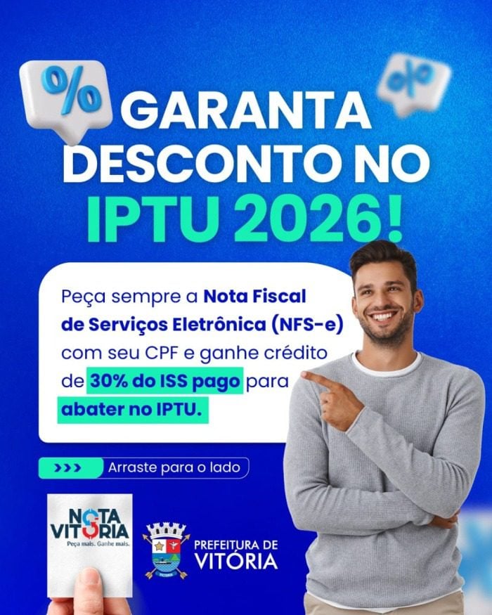 Os moradores de Vitória inscritos no programa Nota Vitória têm até 30 de novembro de 2025 para solicitar o abatimento de créditos no IPTU 2026. O benefício permite utilizar até 30% do Imposto Sobre Serviços (ISS) pago em serviços na capital como desconto direto na guia do IPTU.