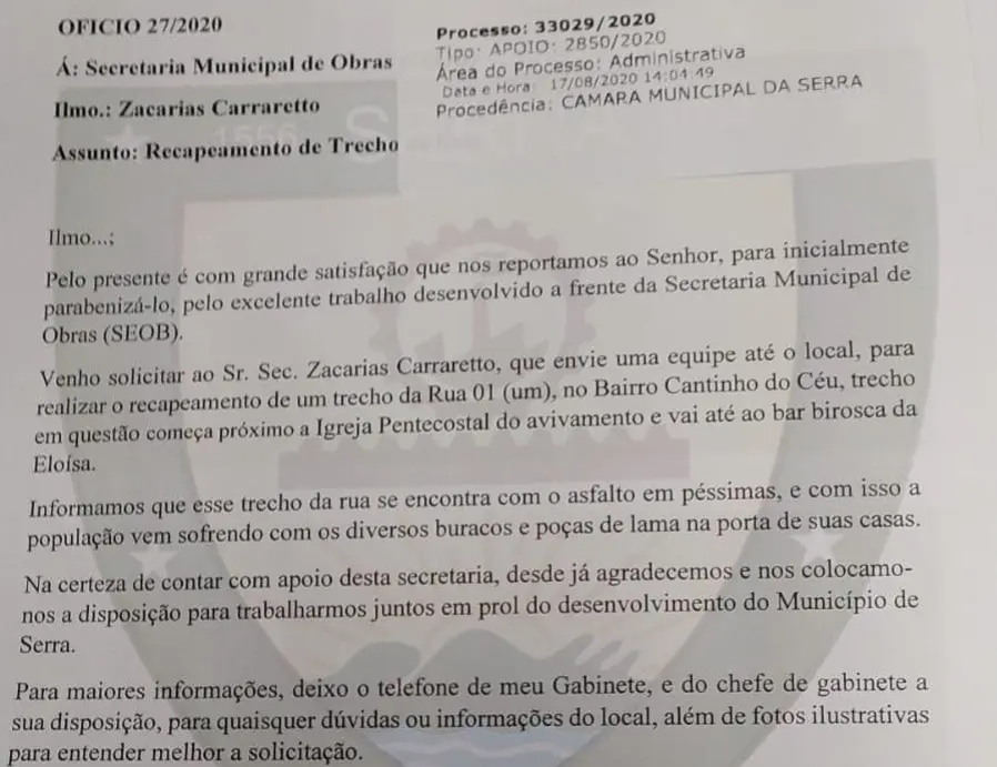 Em conversa com a nossa reportagem, o morador alegou que o problema se estende desde 2019. Em seguida, ele nos enviou uma cópia de uma petição do ano de 2020, onde ele já solicitava os serviços da Prefeitura da Serra. Como é possível ver nas imagens, os pedidos não surtiram efeitos para uma ação concreta do poder público municipal.