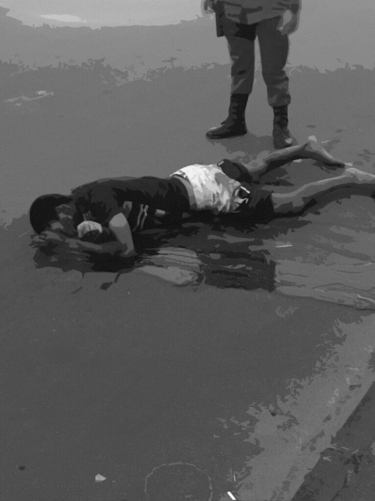 Já na rua Cristalina, o corpo do suposto assaltante, inicialmente identificado como Gustavo Correa dos Santos. Segundo moradores, a vítima é mais conhecida como Gustavo Cracudo.