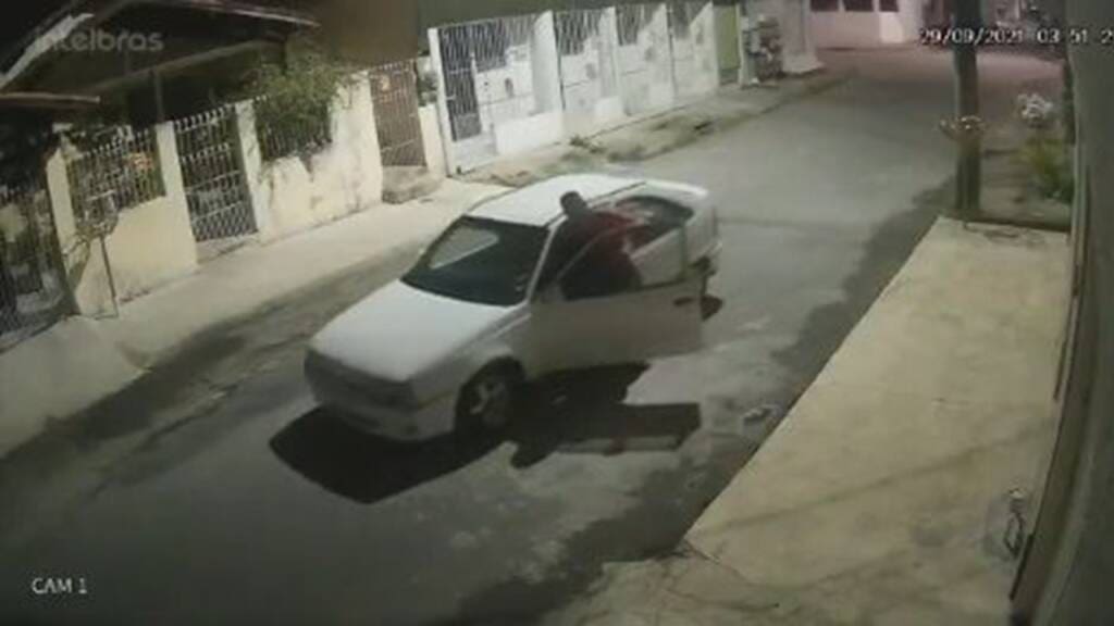 Nas novas imagens, é possível ver o momento em que o criminoso empurra o carro da vítima, para depois os comparsas, já em outro veículo Gol vermelho, rebocarem o Kadett branco.