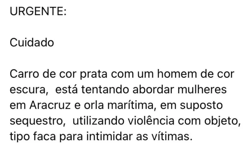 “Gente por favor, cuidado, infelizmente hoje fui uma dessas vítimas e não desejo pra ninguém, estou bem agora, bem machucada, com medo, crise de ansiedade a mil, pensei em chutar ele e bater o carro, mais a velocidade era muita, fiquei com medo de acidente maior, e preferi pular do carro em movimento.” Compartilhou a vítima em mensagem no WhastApp.