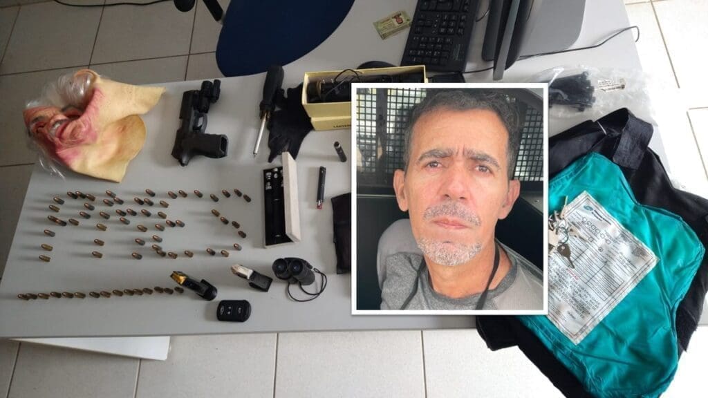 Na última segunda-feira (25), o homem identificado como Odorico Coelho, de 54 anos, foi preso após ser flagrado com um carro roubado, arma, colete, máscara de silicone, munição, mira laser, rojões, facão e cassetete, no município de Ibatiba, no sul do ES.