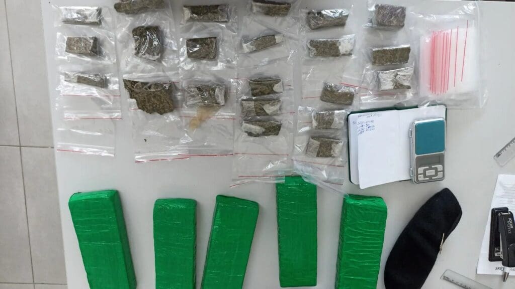 Diante do flagrante, os militares adentraram o apartamento e revistaram o local. No interior da residência, os policiais encontraram tabletes de substância análoga à maconha, porções fracionadas deste mesmo entorpecentes, balança de precisão, caderneta de anotações do tráfico e material para embalo.