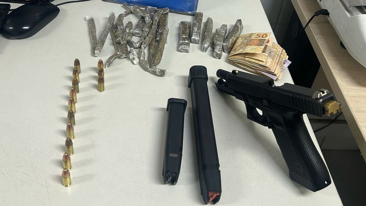 Durante a revista no veículo, foi localizada uma pistola 9mm equipada com adaptador para disparos automáticos, além de um carregador alongado com capacidade para 30 munições. Também foi encontrado um carregador sobressalente, para 17 munições. Ambos estavam com 13 munições cada. No bolso do suspeito que portava a arma, os militares apreenderam R$ 2.300 em espécie.