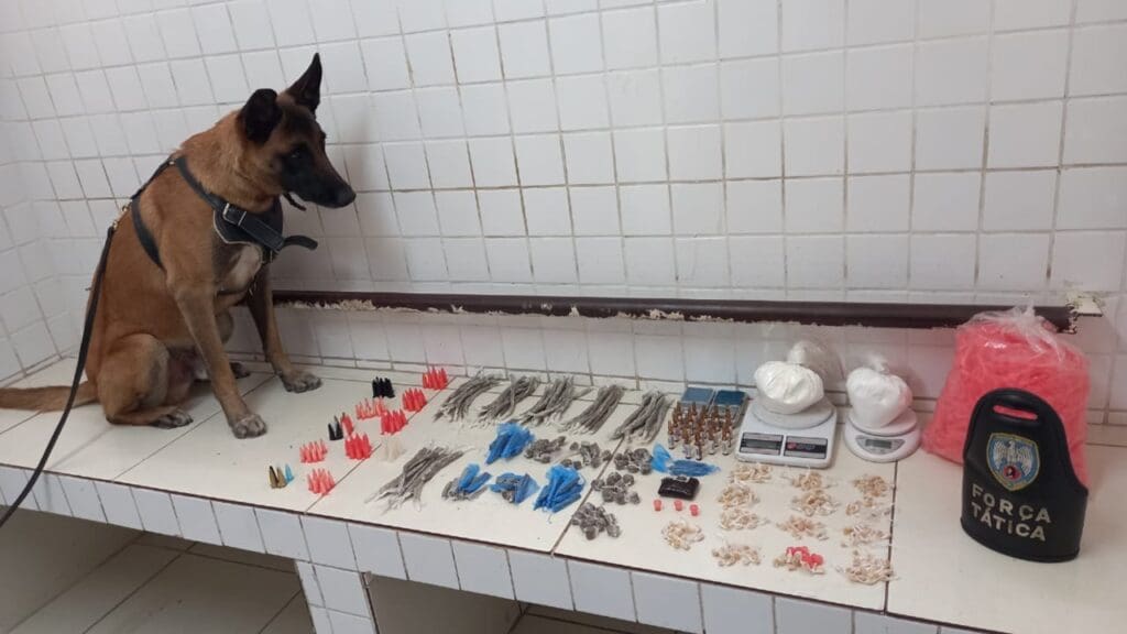 Diante o fato, os policiais entraram na mata e no local foi possível visualizar vários materiais para o embalo de entorpecentes. Em seguida, drogas foram localizadas. Por ser um local de mata extensa, foi solicitado apoio da equipe K9 do 6º Batalhão. Com a ajuda do cão Apollo mais substâncias foram encontradas.