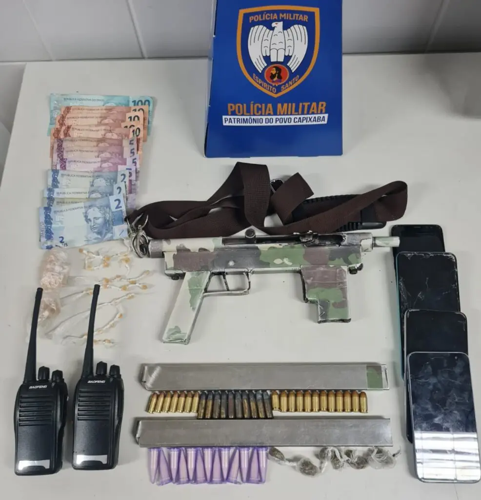 Com o menor de idade, os militares encontraram uma submetralhadora de fabricação caseira, com bandoleira e ainda com seis munições não deflagradas. Constaram que o menor ficou ferido, pois havia sido baleado na região do quadril.