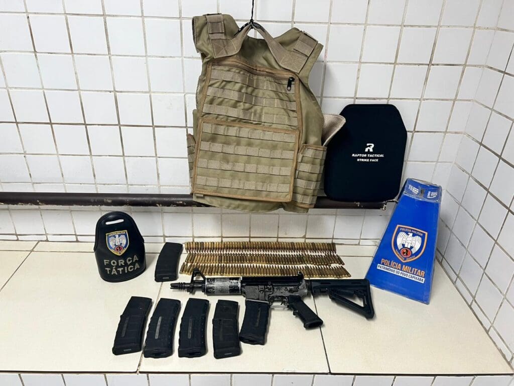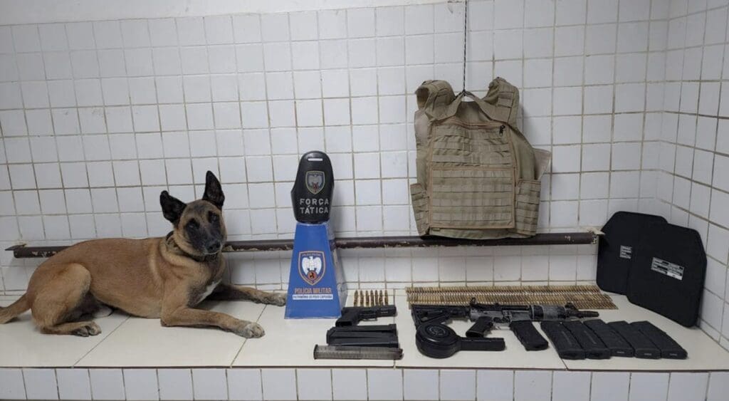 O cão Apolo, especialista em detecção de armas e entorpecentes, indicou a presença de material ilícito em um amontoado de roupas. No local, foi encontrado um fuzil Colt e uma bolsa contendo cinco carregadores sobressalentes municiados, totalizando 143 munições calibre 5.56, além de um colete balístico com duas placas balísticas.