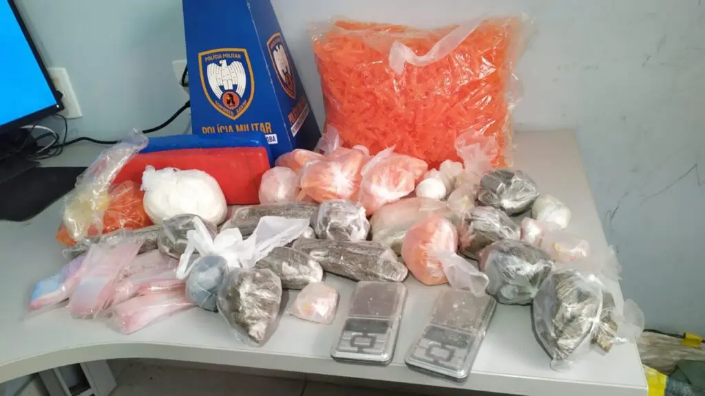 A princípio, o que chamou a atenção foi a quantidade considerável de diversos tipos de drogas nessa mochila. Segundo o boletim policial, o conteúdo apreendido foi de: 438 pinos de cocaína; 238 pedras de crack; 349 buchas de maconha; 1 tablete de 25x10cm de cor azul e outro de 29×9 cm de cor vermelha de substância similar a maconha; meia barra de crack; 3 pacotes de cocaína; 2 balanças de precisão; 2 pinos vazios e 7 pacotes de embalagem plástica.