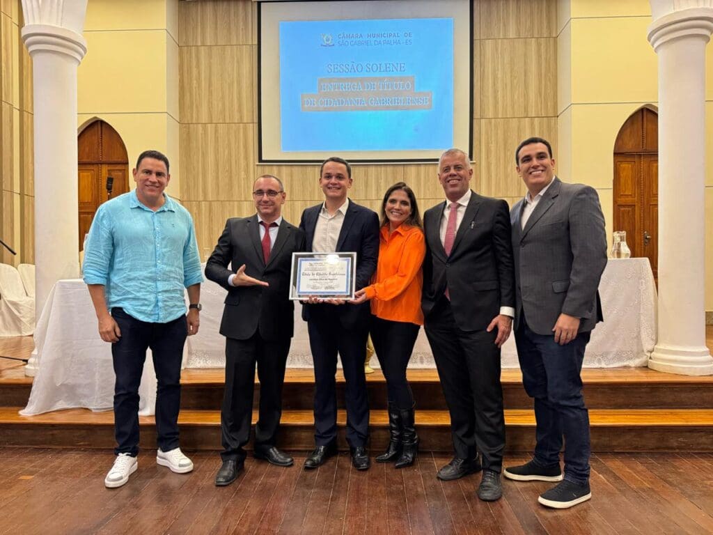 Na última sexta-feira (16), o prefeito de Vitória, Lorenzo Pazolini (Republicanos), recebeu o Título de Cidadão Gabrielense pela Câmara Municipal de São Gabriel da Palha, durante uma Sessão Solene. Na companhia de sua esposa, Paula de Pazolini, o prefeito foi calorosamente recebido por autoridades locais, lideranças comunitárias e moradores do município, que lotaram o plenário para prestigiar a cerimônia.