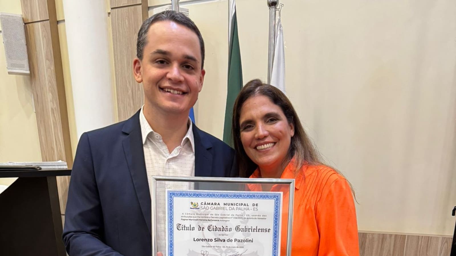 Na última sexta-feira (16), o prefeito de Vitória, Lorenzo Pazolini (Republicanos), recebeu o Título de Cidadão Gabrielense pela Câmara Municipal de São Gabriel da Palha, durante uma Sessão Solene. Na companhia de sua esposa, Paula de Pazolini, o prefeito foi calorosamente recebido por autoridades locais, lideranças comunitárias e moradores do município, que lotaram o plenário para prestigiar a cerimônia.