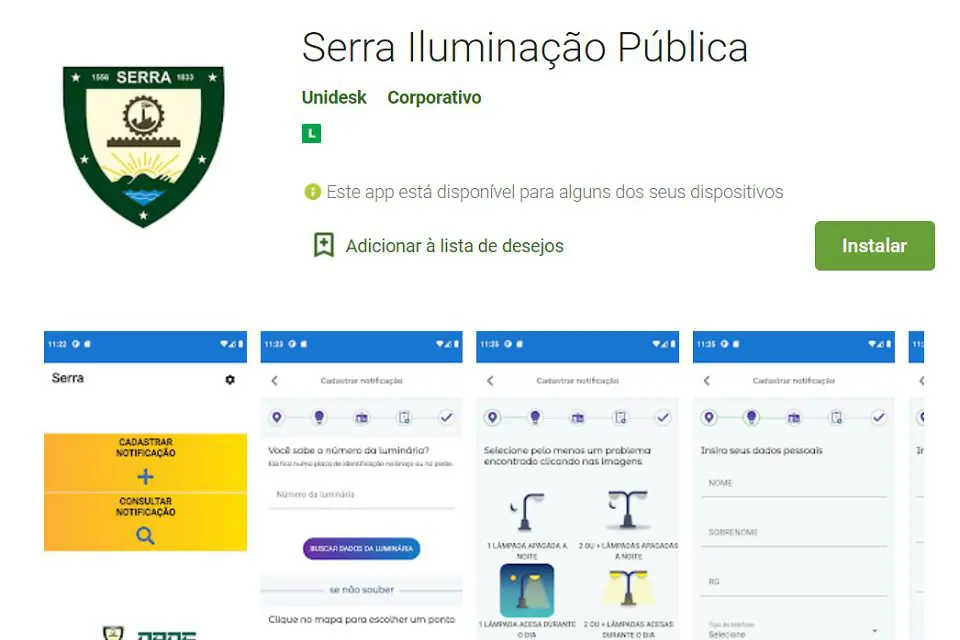 O app é gratuito e está disponível para Android e IOS. Com interface simples e de fácil acesso, o “Serra Iluminação Pública” permite fácil navegação e registro da ocorrência por parte do munícipe.