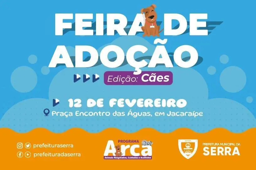Dentro do projeto Arca (Animais Resgatados, Cuidados e Acolhidos), a prefeitura da Serra, por meio da Secretaria de Desenvolvimento Urbano e Meio Ambiente, realiza no próximo sábado (12), na praça Encontro das Águas, em Jacaraípe, a primeira feira de adoção de animais recolhidos pelo programa.