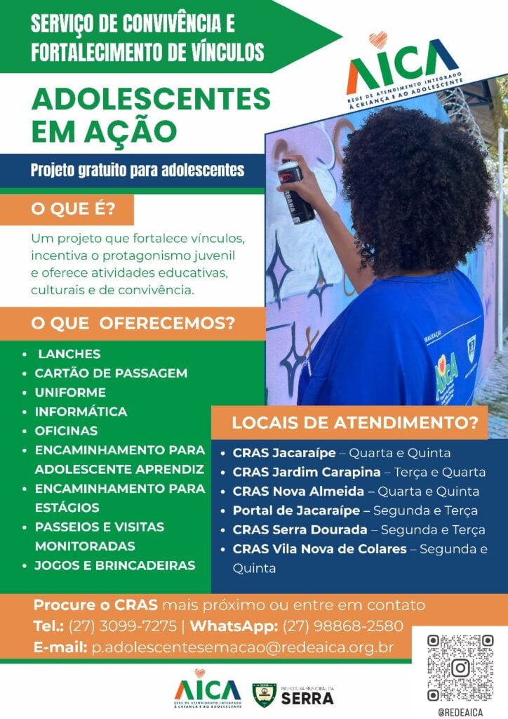 A Rede AICA anunciou a ampliação do Núcleo Adolescentes em Ação, projeto voltado ao fortalecimento de vínculos familiares e comunitários de jovens da Serra. A partir de agora, adolescentes de Jacaraípe e Nova Almeida passam a ser contemplados pela iniciativa, que integra o Serviço de Convivência e Fortalecimento de Vínculos (SCFV).