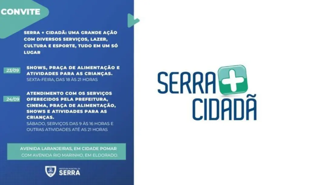 A Prefeitura da Serra realiza, entre os dias 23 e 24 de setembro a quarta edição do Serra + Cidadã. O Dia “D” desta será no sábado (24), em Cidade Pomar, com serviços de 09h às 16h, na Avenida Rio Marinho.