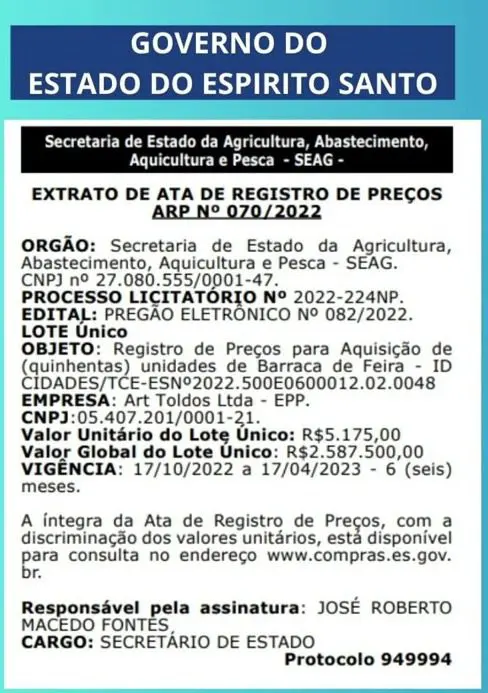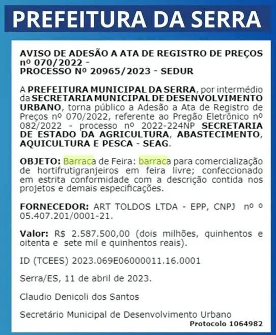 “Existe um contrato entre a prefeitura da Serra e a empresa Art Toldos Ltda para a confecção de 500 barracas para comercialização de hortifrutigranjeiros em feiras livre. Mas este contrato segue a adesão à ARP 070/2022, da SEAG cujo ‘Termo de Referência’ não apresenta nenhum projeto ou alusão a barracas com menos de 6,25m², ainda mais em uma barraca de apenas 2,0 metros por 1,0 metro (2×1)”, explica Bulhões.