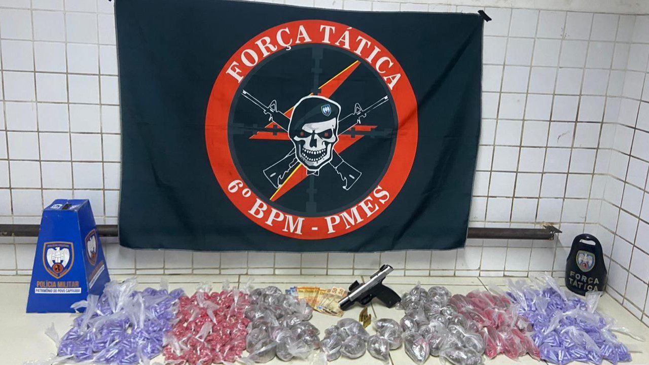 Durante as buscas realizadas no local, os policiais militares localizaram uma pistola calibre 9mm, carregada com 13 munições, além de uma sacola recheada de drogas. No interior da sacola foram apreendidas 1.725 pedras de crack, 2.013 pinos de cocaína e 1.090 buchas de maconha, além de um aparelho celular e R$ 281 em espécie.
