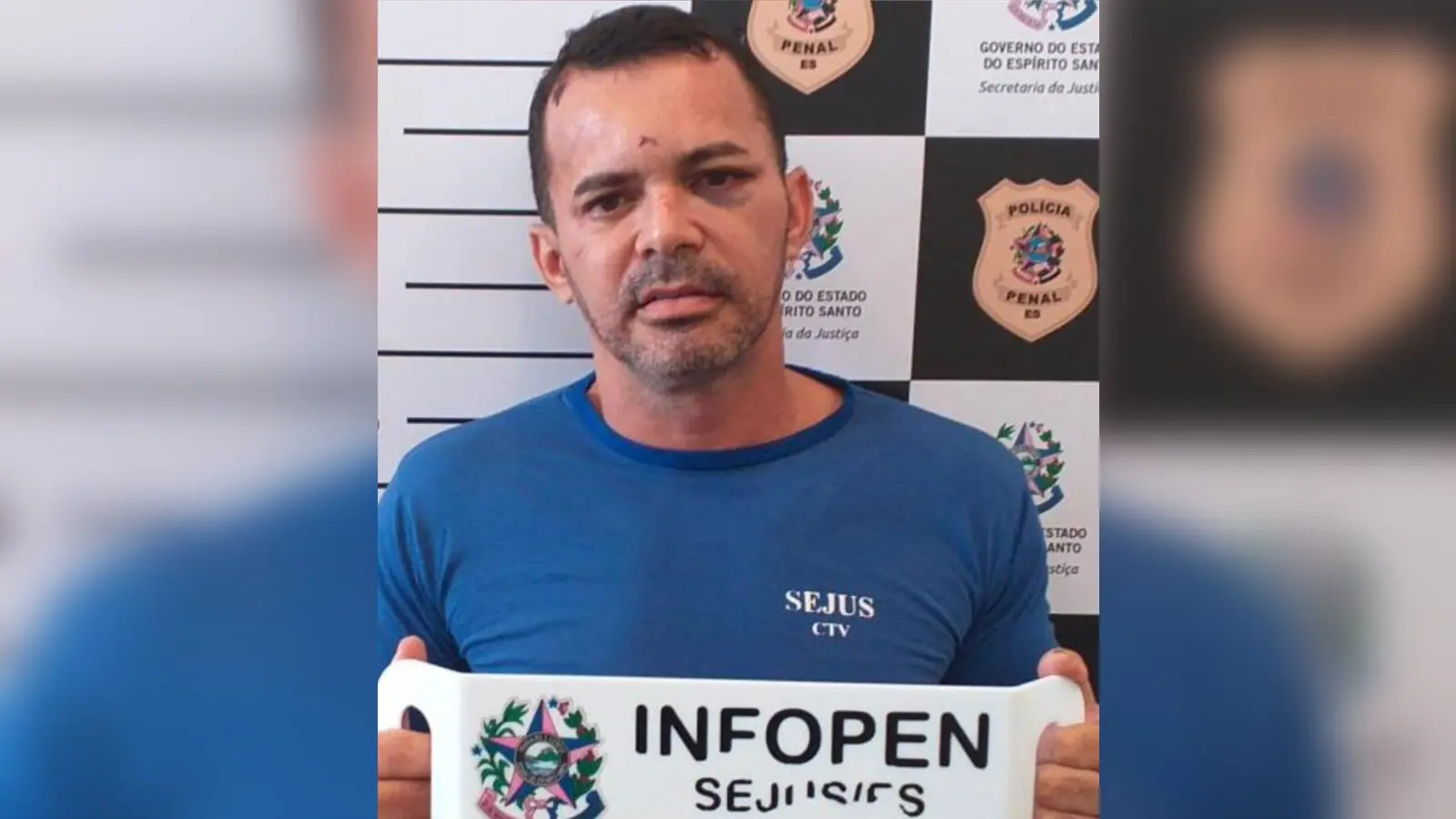 A foto, conhecida como “mugshot”, teria sido registrada no Centro de Triagem de Viana (CTV), unidade ligada à SEJUS. Na imagem, ele aparece segurando a placa de identificação e usando o típico uniforme azul do sistema prisional, além de apresentar marcas e ferimentos visíveis, que seriam consequência da confusão que levou à detenção.