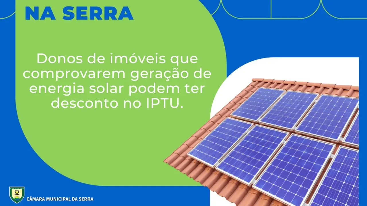 Para incentivar a adesão a este tipo tecnologia, vereadores aprovaram, durante Sessão Ordinária realizada nesta segunda-feira (4) na Câmara Municipal da Serra, o PL Nº 75/2022, de autoria do vereador Professor Artur, que dispõe sobre a concessão de desconto no IPTU dos proprietários de imóveis que comprovarem geração de energia solar.