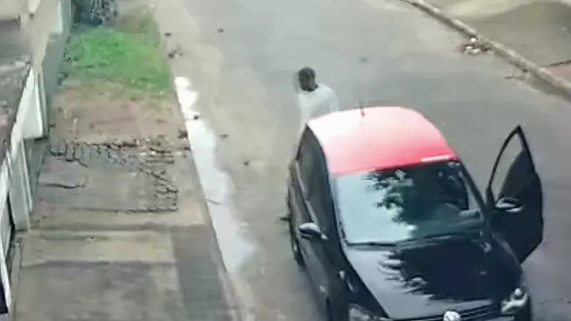 Logo depois, um indivíduo aparece caminhando pela via. Ao notar o portão e a porta do veículo abertos, ele entra na residência, aborda o comerciante e anuncia o assalto. Após pegar a chave do carro, o criminoso entra no automóvel e foge em alta velocidade.
