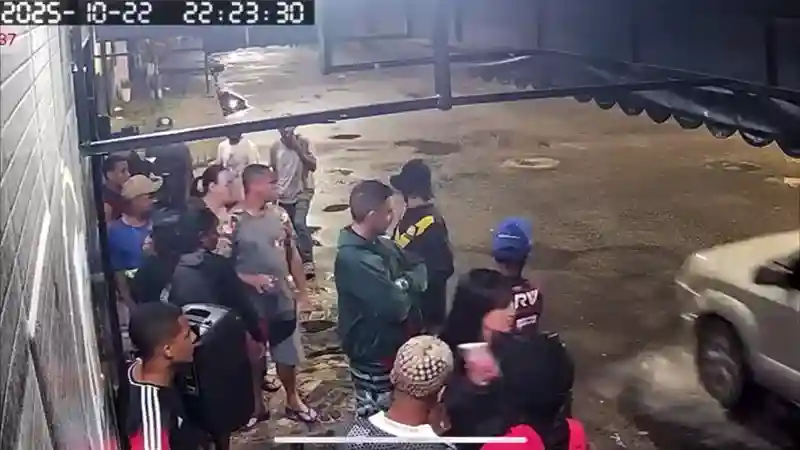 As imagens exibem um veículo modelo Tucson, de cor prata, parando em frente à distribuidora. A calçada estava lotada de pessoas. No instante em que os disparos começam, há correria e pânico: frequentadores tentam se proteger e fugir, mas várias pessoas acabam baleadas. Logo depois, os criminosos fogem do local.