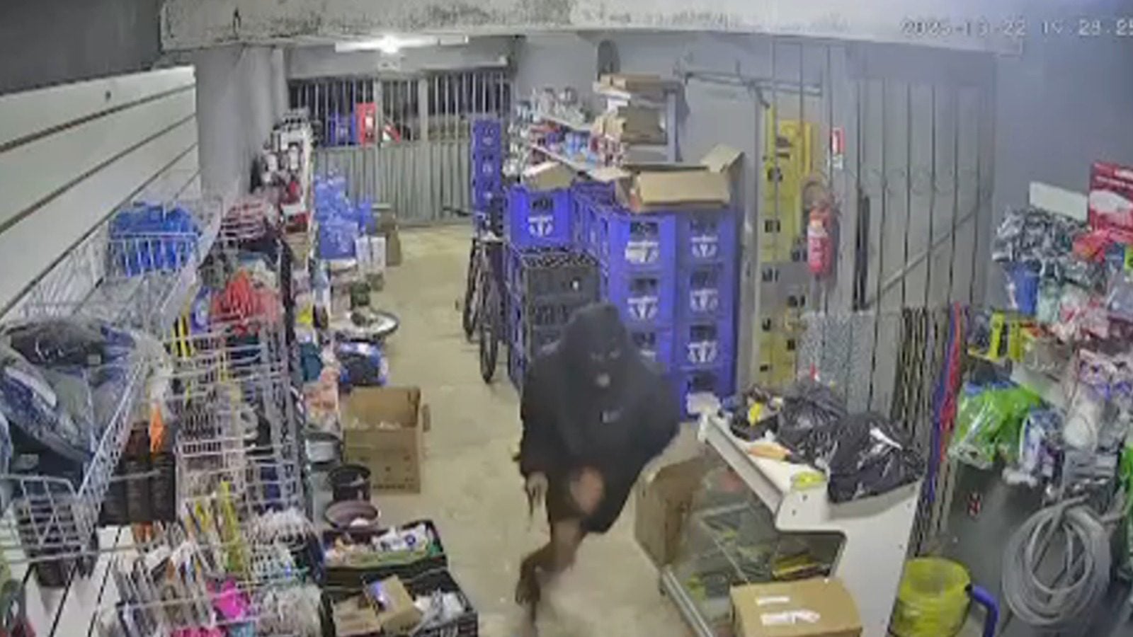 No momento em que os criminosos deixam o estabelecimento, são flagrados por uma criança desce a escada interna do estabelecimento. A criança se assusta ao ver os homens encapuzados e armados fugindo do local.