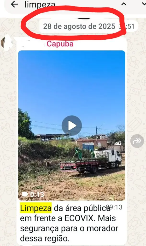 A reportagem questionou a moradora sobre quando ocorreu o último serviço de poda e capina nesse terreno. Segundo Patrícia, a última vez que a prefeitura realizou a manutenção do local foi há seis meses, em agosto de 2025, conforme aponta o print de mensagens enviadas pela moradora.