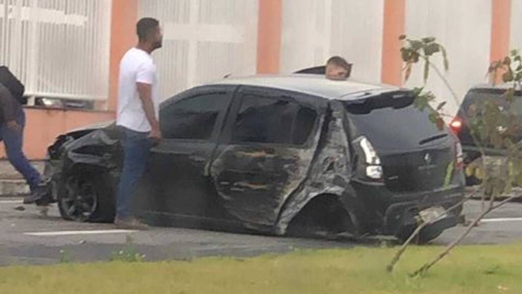 Mesmo o motorista e o veículo sem condições de seguir caminho, ele continuou forçando ao tentar dirigir o carro, mesmo todo destruído.