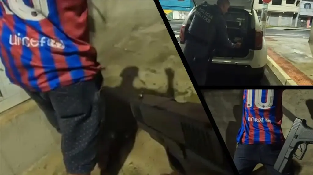 Durante o tradicional baculejo foi encontrado um simulacro, na cintura do homem de 32 anos, a arma falsa é semelhante a uma pistola de modelo Glock G22. O fato de ter sido removido a ponta laranja da pistola de airsoft, configura como sendo simulacro, objeto muito utilizado durante assaltos.
