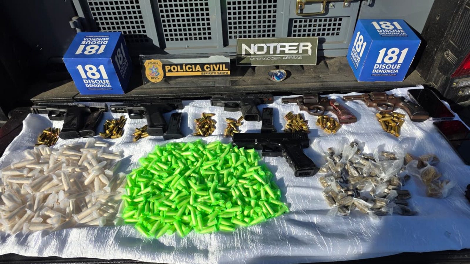 A Operação Carapebus terminou com a apreensão de cinco armas, um simulacro, drogas e rádios de comunicação. Dois homens foram presos. Um deles, de 26 anos, admitiu que guardava armas para uma facção criminosa e será autuado em flagrante por tráfico de drogas, porte ilegal de armas e associação criminosa. O outro, de 28 anos, responderá por porte ilegal de arma de fogo. Ambos serão encaminhados ao sistema prisional após os procedimentos de polícia judiciária.