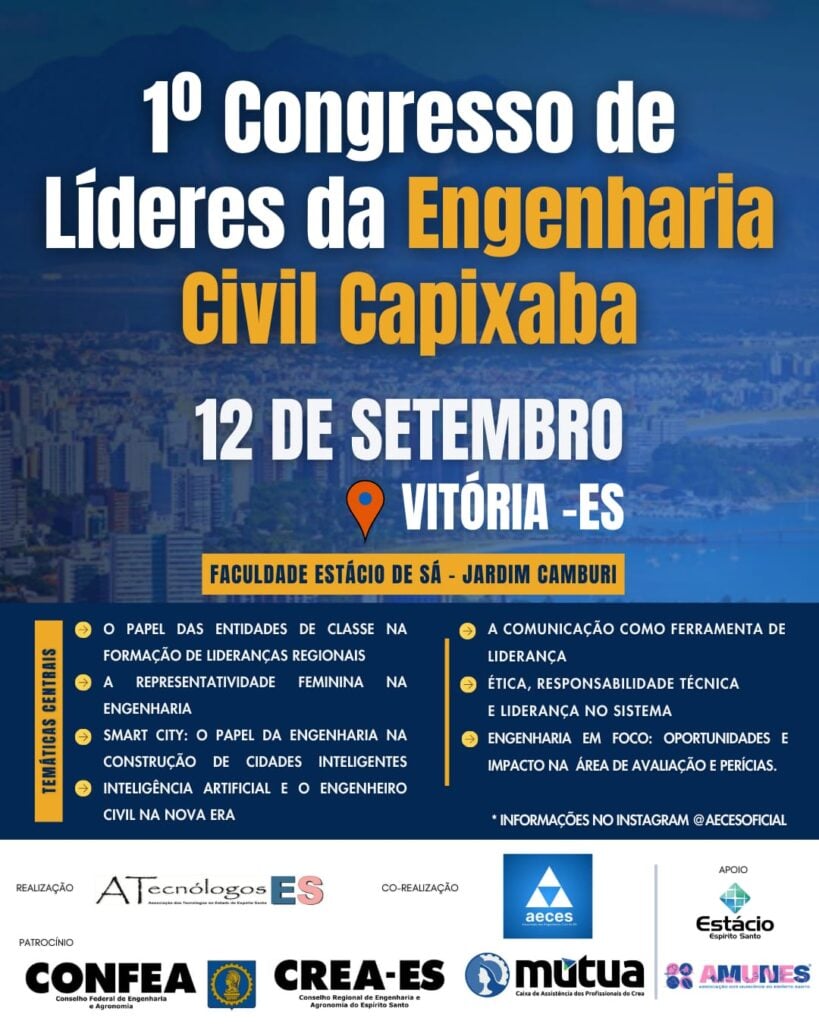 Na próxima sexta-feira (12), Vitória será palco do 1º Congresso de Líderes da Engenharia Civil Capixaba, um marco para a categoria no Espírito Santo. O evento, promovido pela Associação dos Engenheiros Civis do Espírito Santo (AECES), em parceria com o Crea-ES, Confea e Mútua, acontecerá na Faculdade Estácio de Sá, em Jardim Camburi, e reunirá especialistas, profissionais atuantes e acadêmicos para debater os rumos do setor frente aos desafios da modernidade, sustentabilidade e transformação digital.