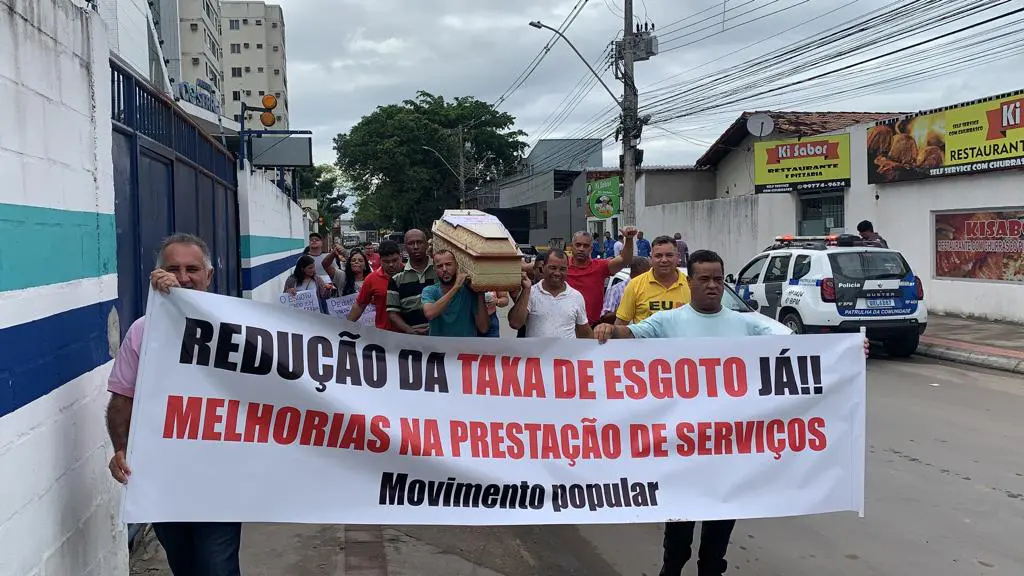 Os manifestantes, munidos de cartazes e faixas, reivindicavam melhorias na qualidade dos serviços, além da redução dos valores cobrados nas taxas de esgoto
